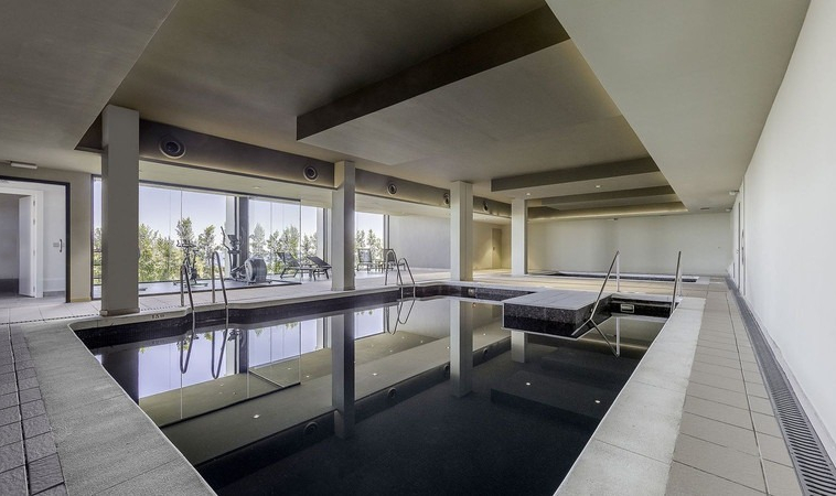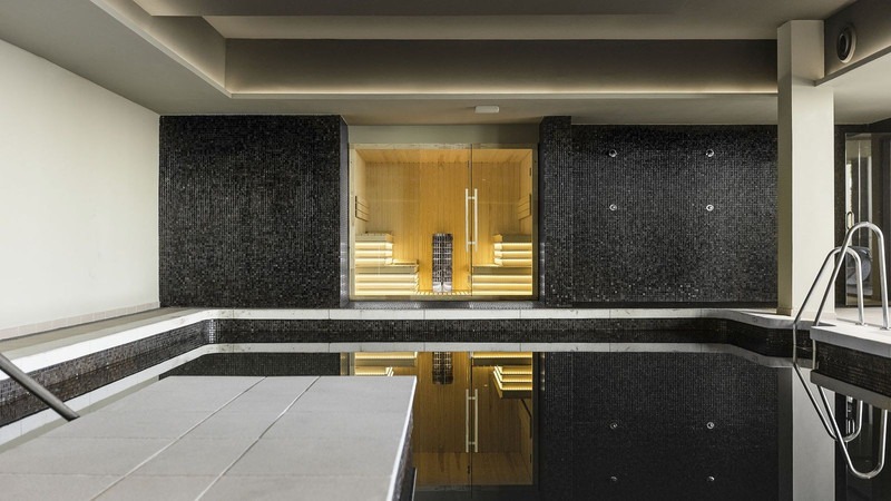 The wellness area features an indoor pool, sauna,