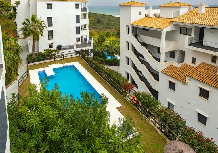 beautiful terrace with direct views over the communal swimming pool and out to the sea,