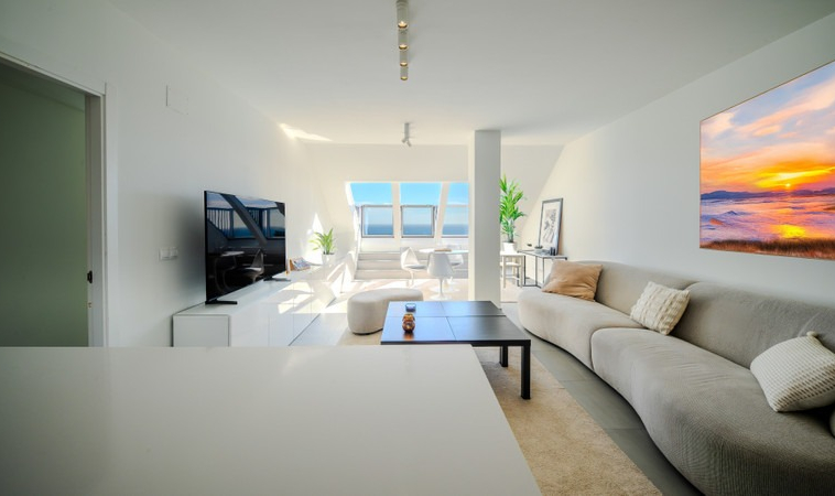 The penthouse features a bright and expansive living area with an