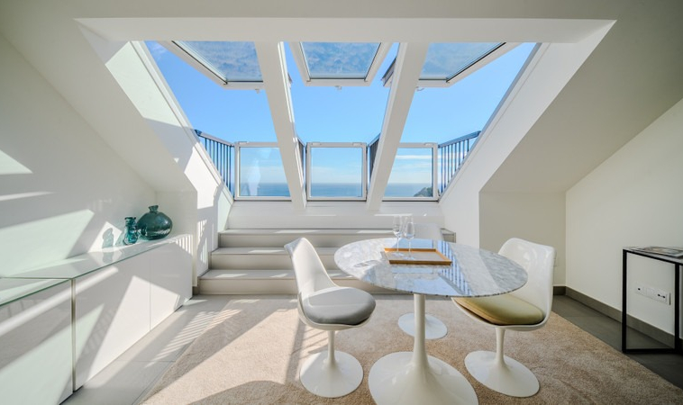 The high-end extra-large Velux windows offer maximum light and ventilation and come with a